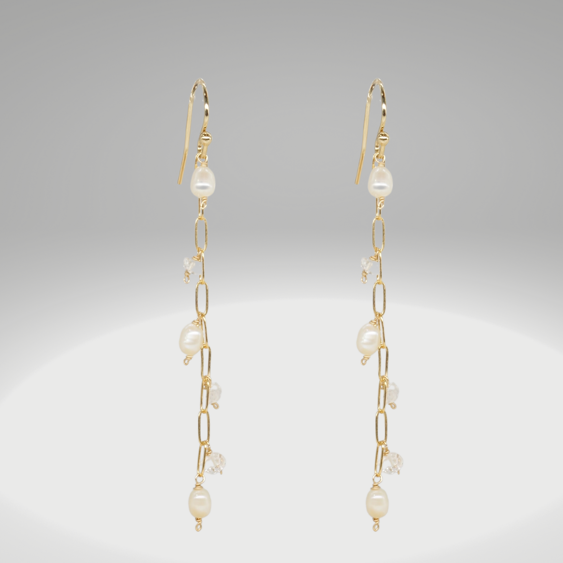 Cascading pearl and herkimer diamond earrings that luster.