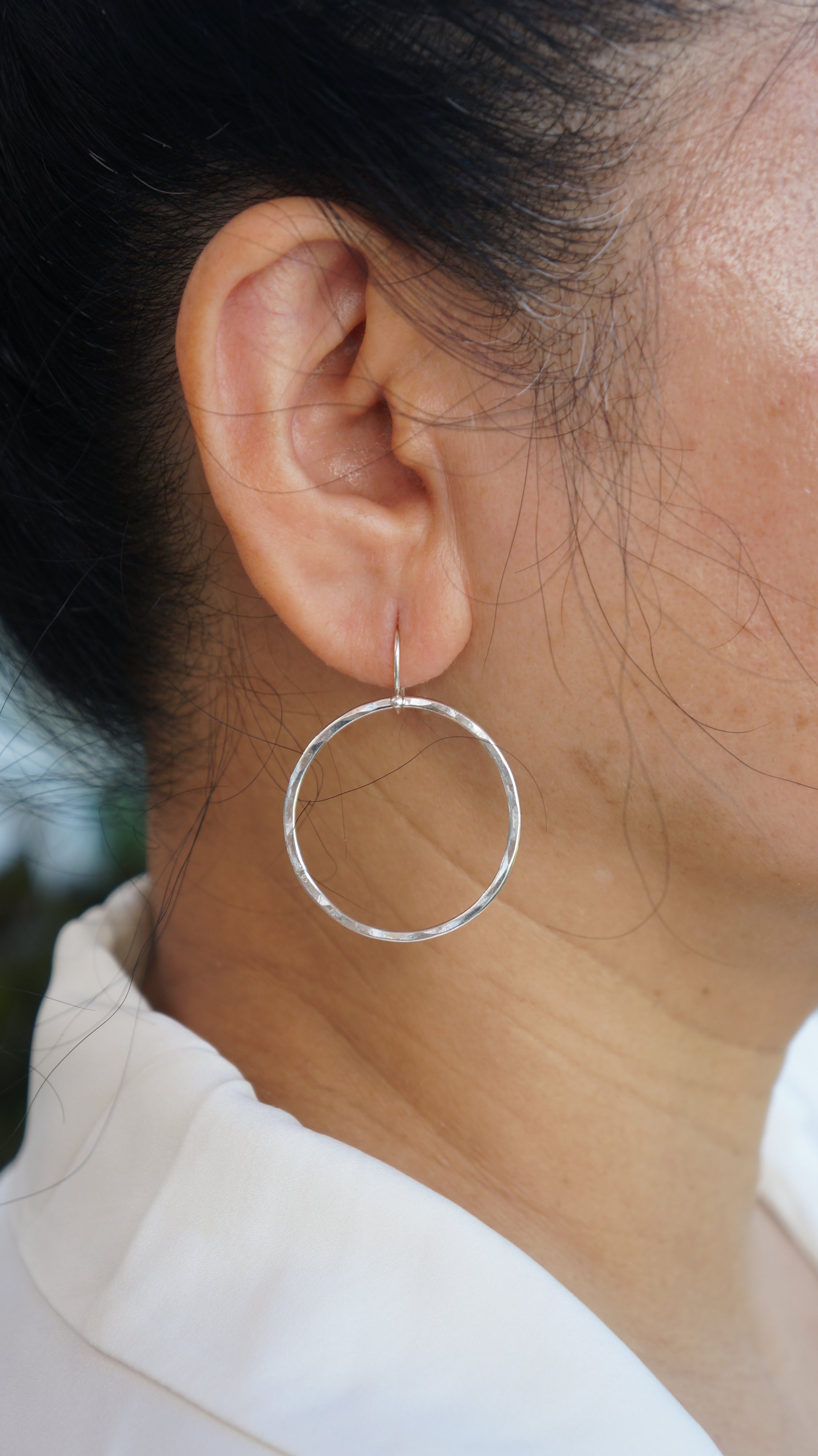 Drop hoop earrings for your everyday look. The Float Hoop Earrings have a beautiful hammered finish.