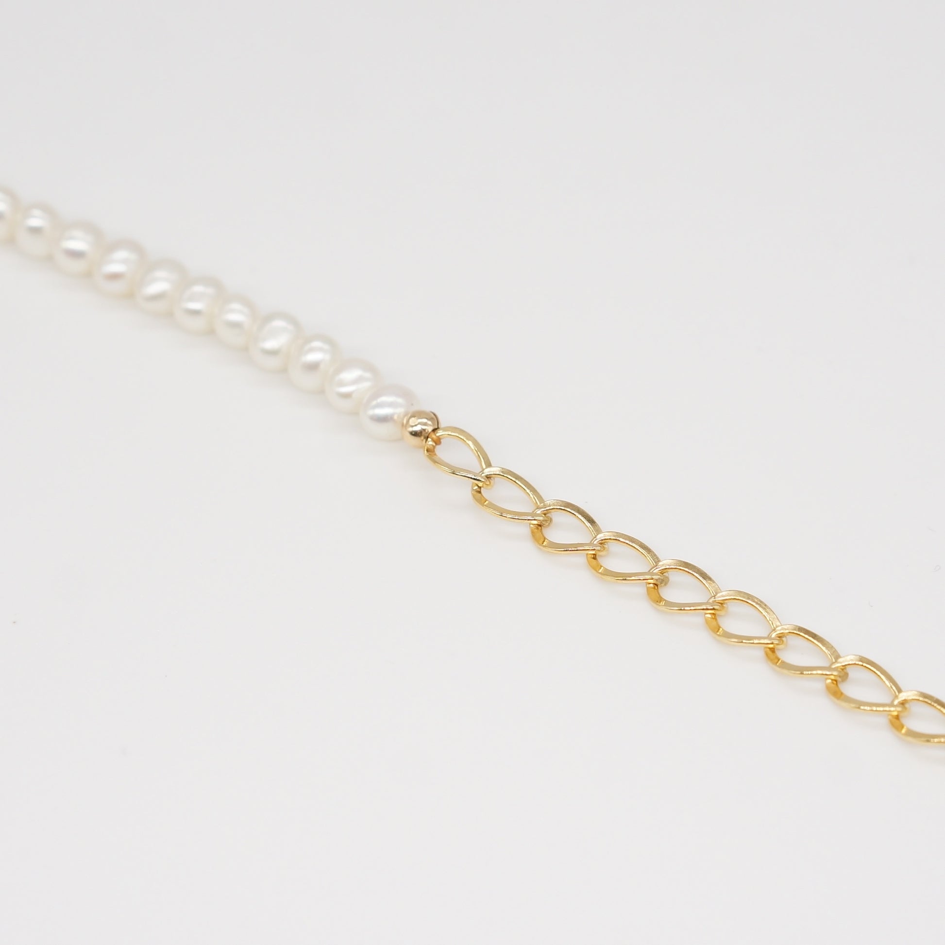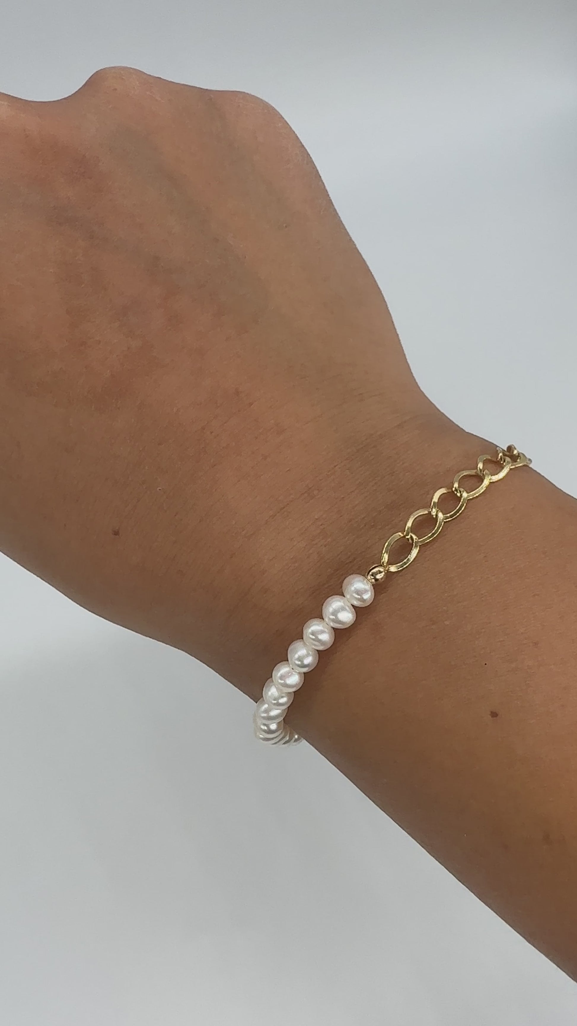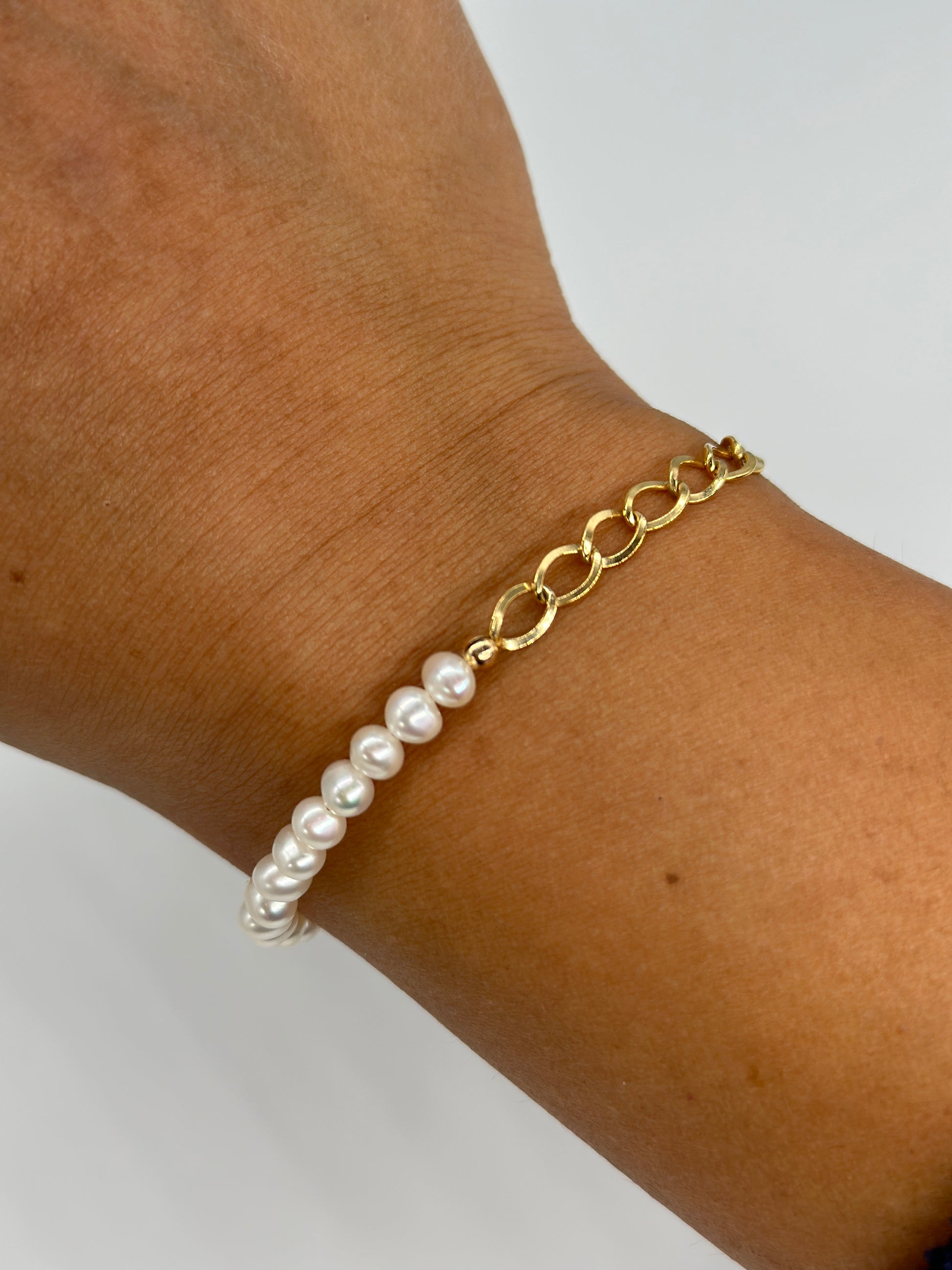 A unique and organic shaped pearl bracelet. Part chain, part a strand of pearls. A mixture two designs.